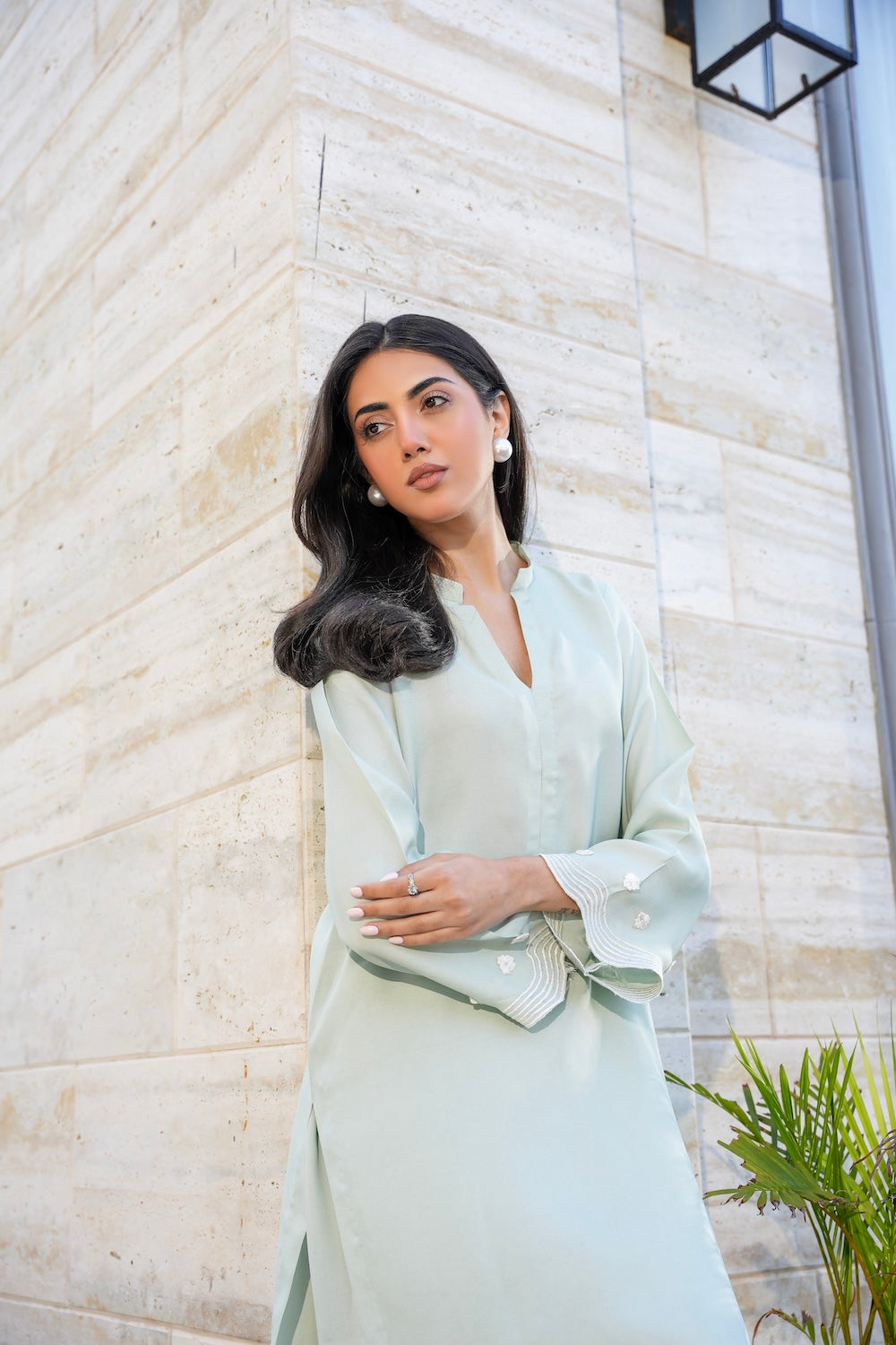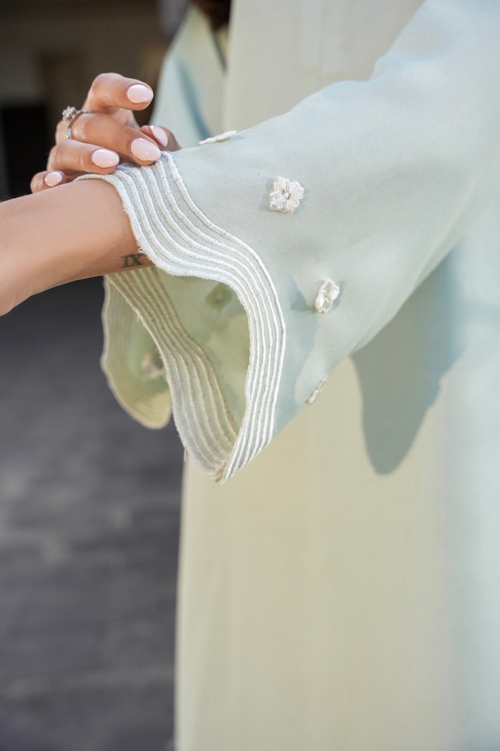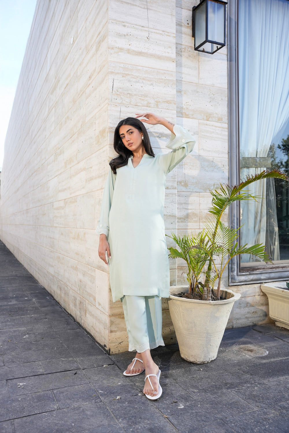 A dreamy blend of delicate details and effortless charm, this ensemble features intricate embroidery on the sleeves and neckline, adding a touch of elegance. Paired with sleek slit pants for the perfect flow, Veyra is designed for refined style with a modern edge.