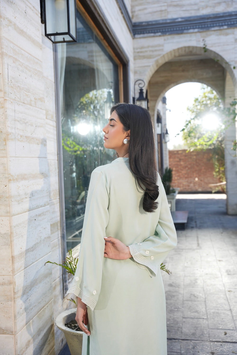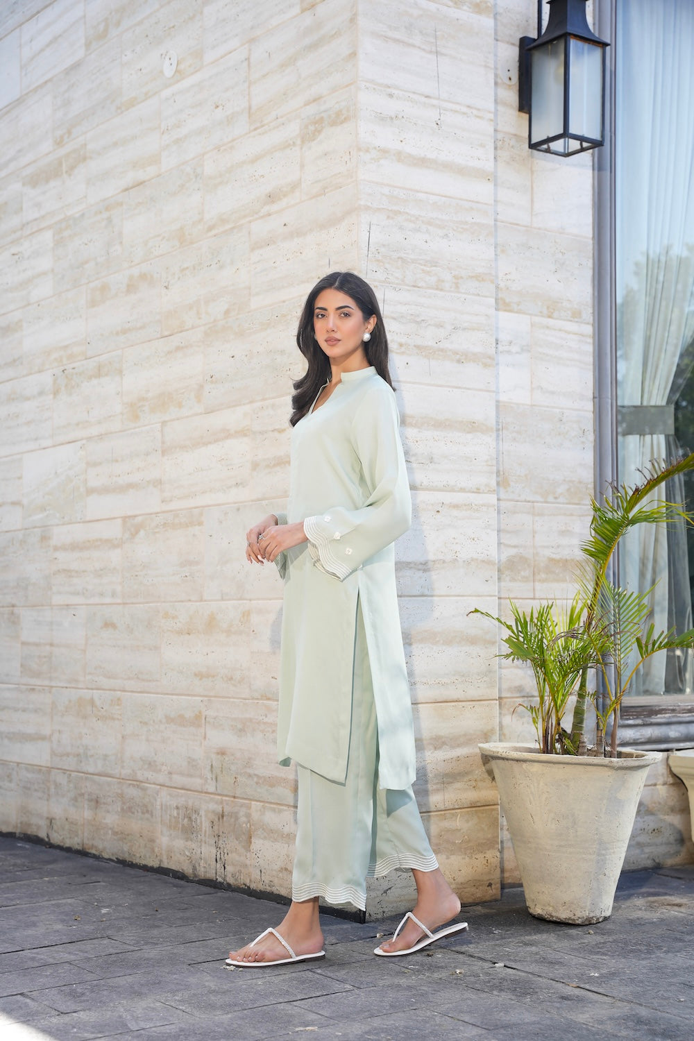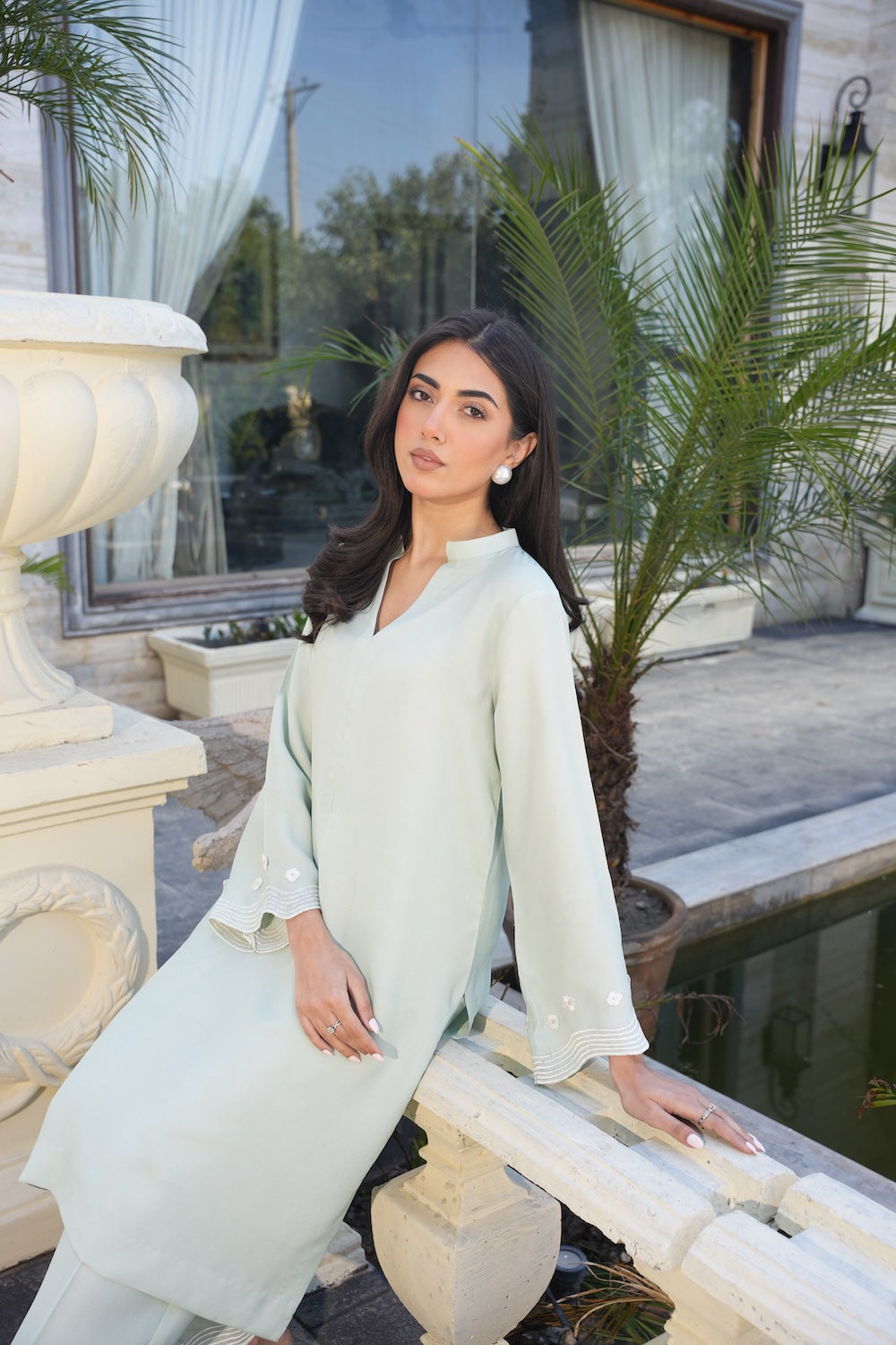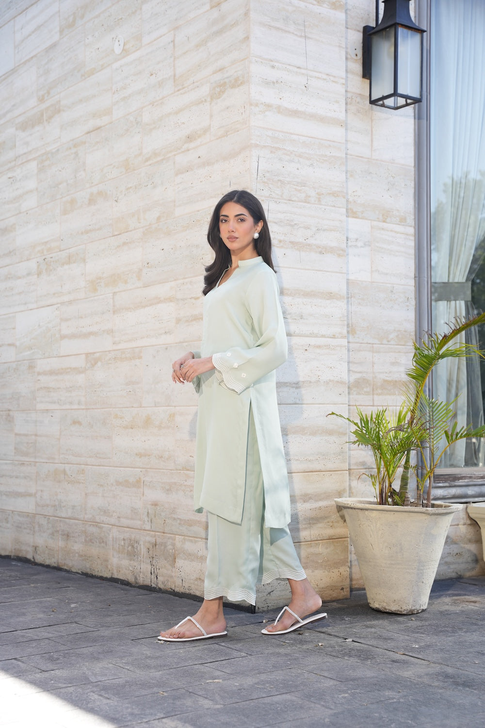A dreamy blend of delicate details and effortless charm, this ensemble features intricate embroidery on the sleeves and neckline, adding a touch of elegance. Paired with sleek slit pants for the perfect flow, Veyra is designed for refined style with a modern edge.