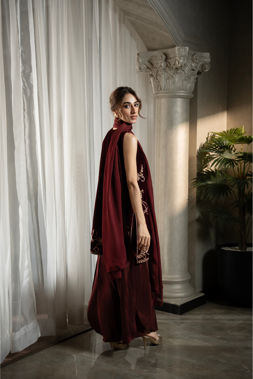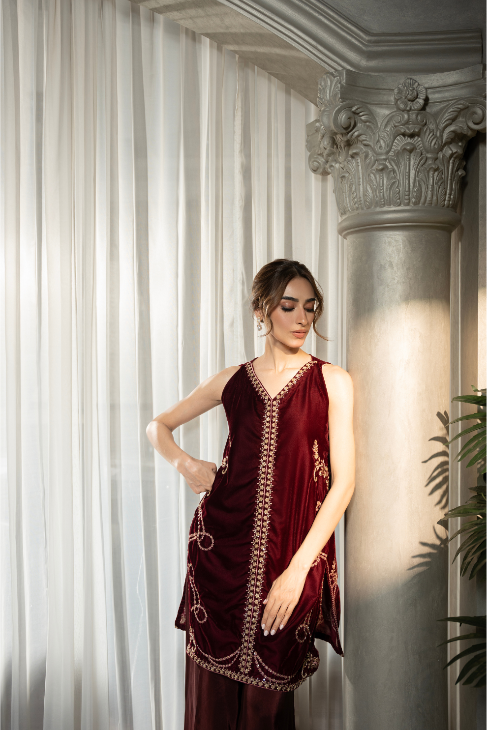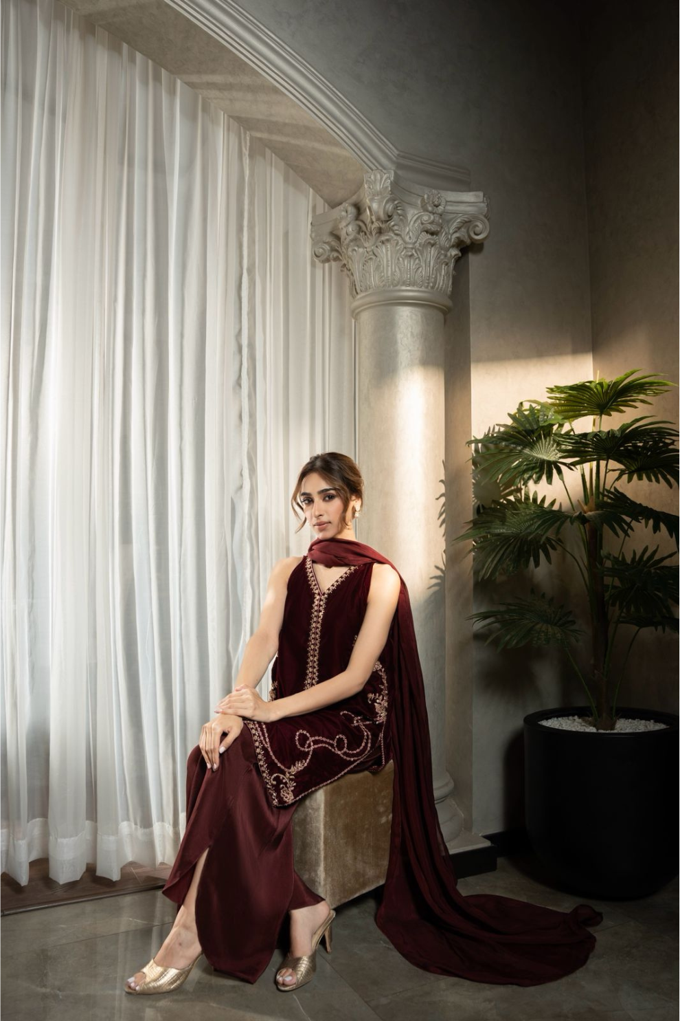 Rich velvet in deep maroon with subtle embroidery and embellishments. Paired with AZ