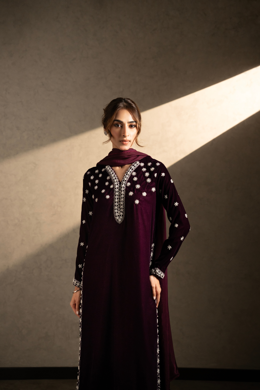 A deep purple long shirt with full fitted sleeves, featuring intricate silver embroidery across the front, back, and sleeves, accented with delicate pearly embellishments. Semi-formal and luxe, perfect for formal events.