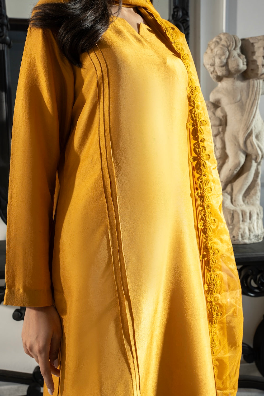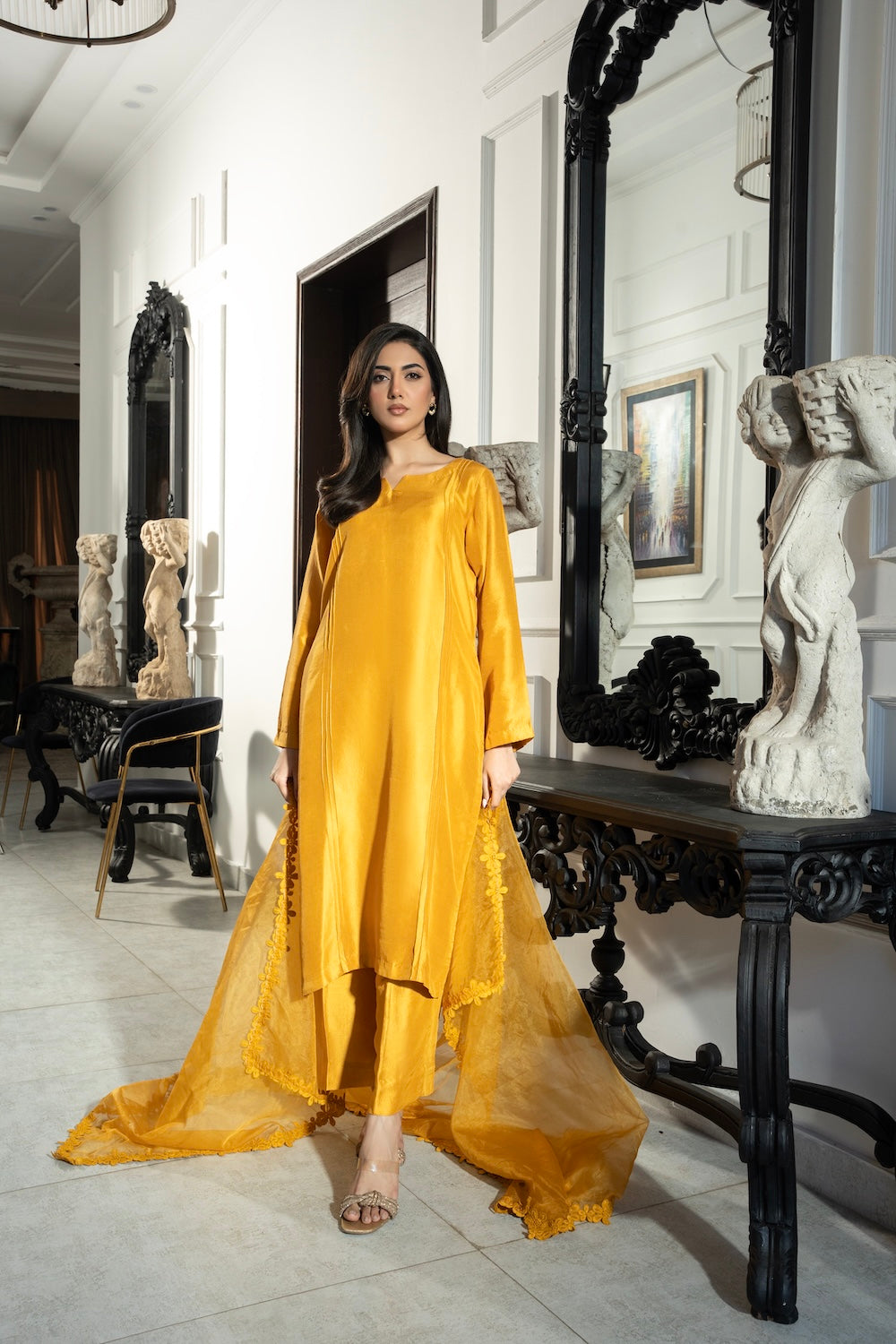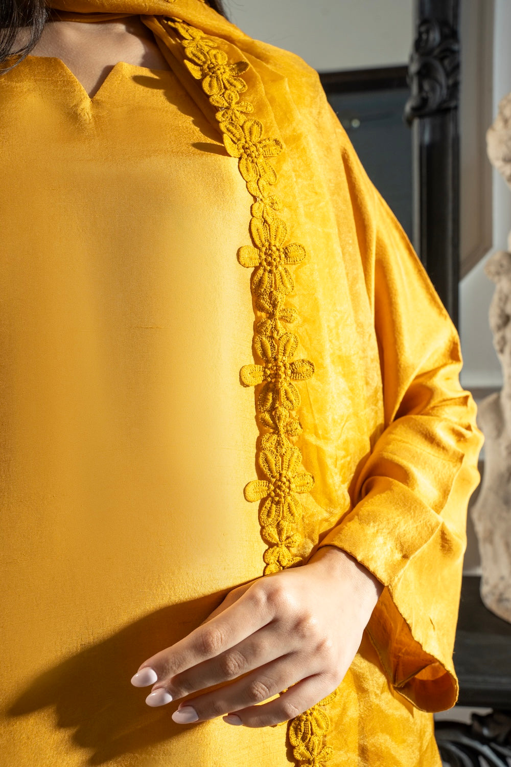 This mustard yellow ensemble pairs a pleated long shirt with a boat neckline and tailored culottes, finished with a floral cutwork dupatta. Elegant and modern, it’s a timeless choice for any occasion.
