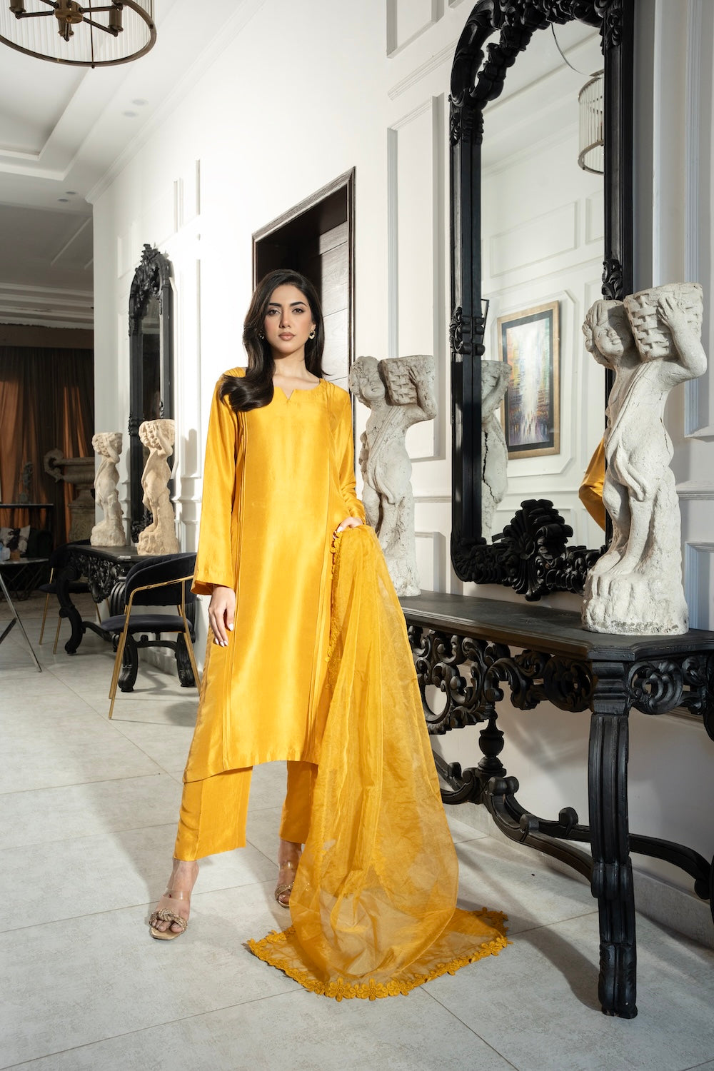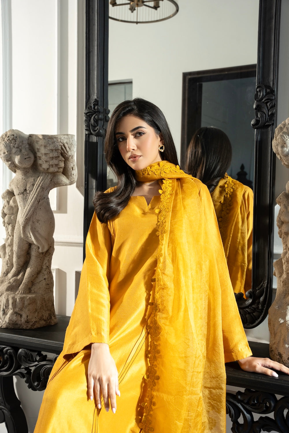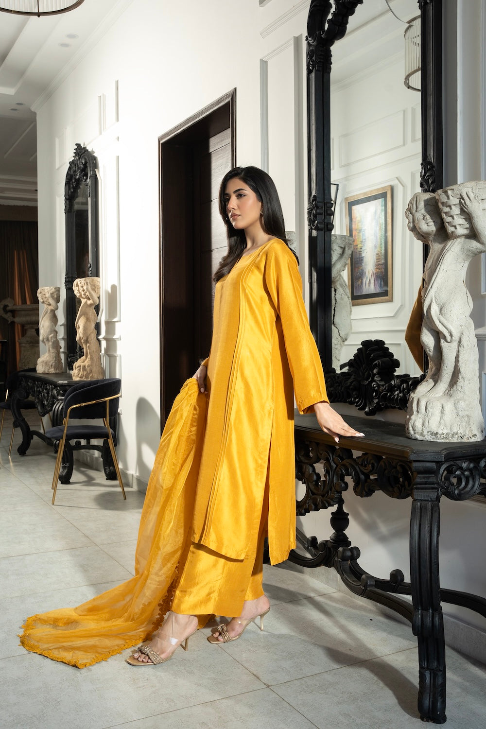 This mustard yellow ensemble pairs a pleated long shirt with a boat neckline and tailored culottes, finished with a floral cutwork dupatta. Elegant and modern, it’s a timeless choice for any occasion.