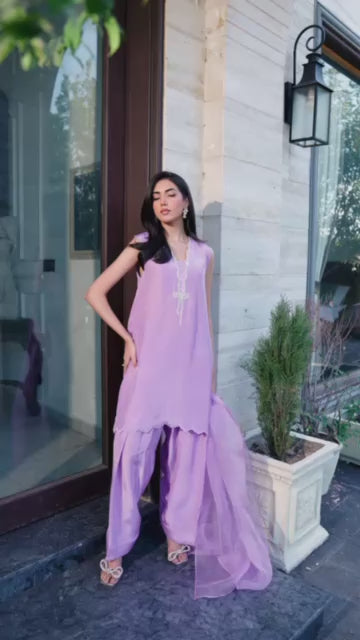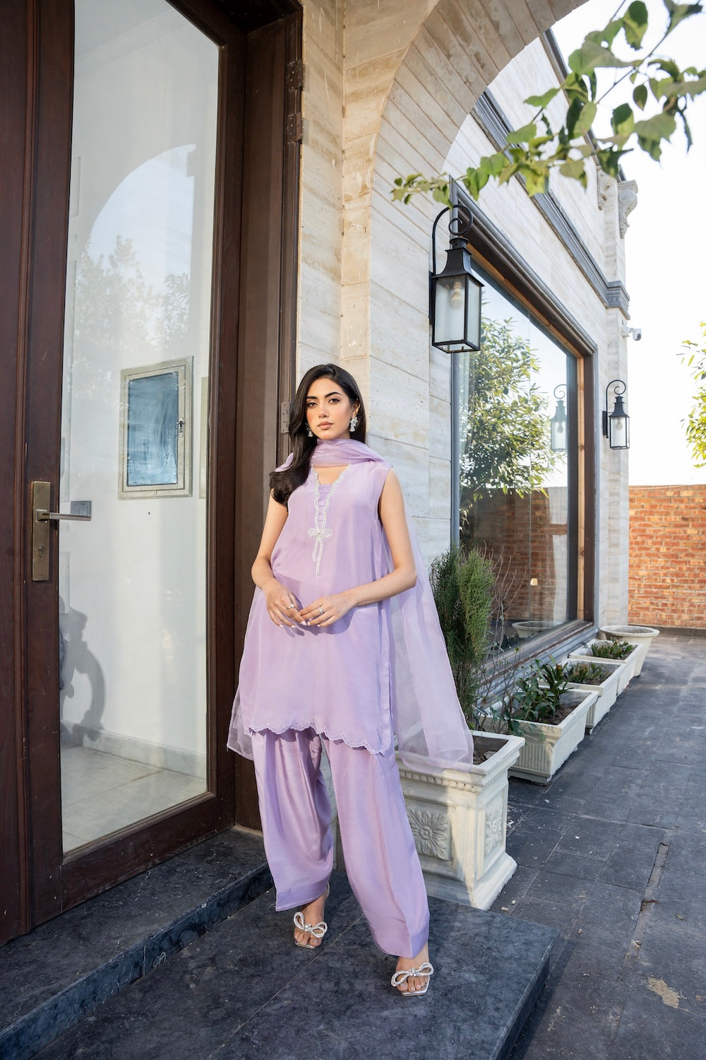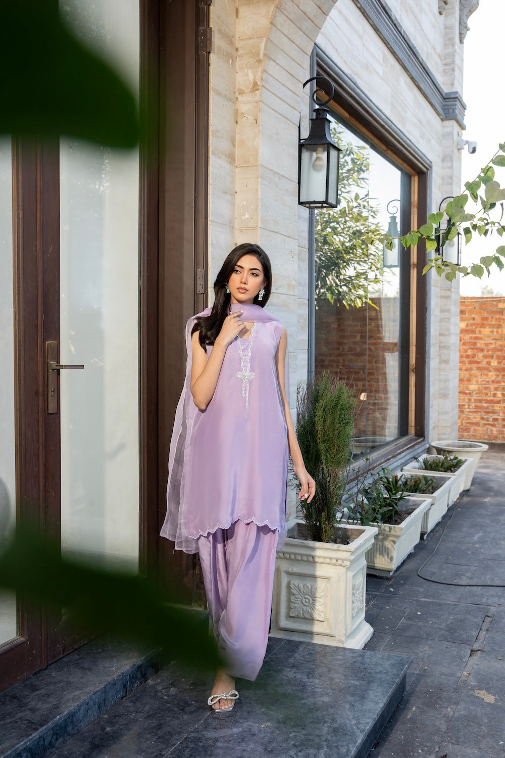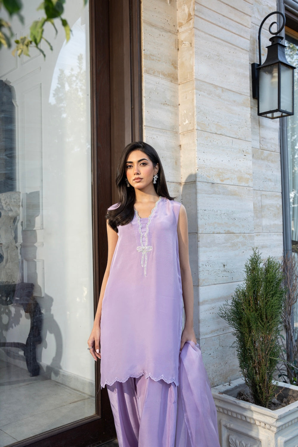 Timeless and elegant, this lilac silk ensemble features a Swarovski bow detail and delicate embroidery—perfect for festive and formal occasions.