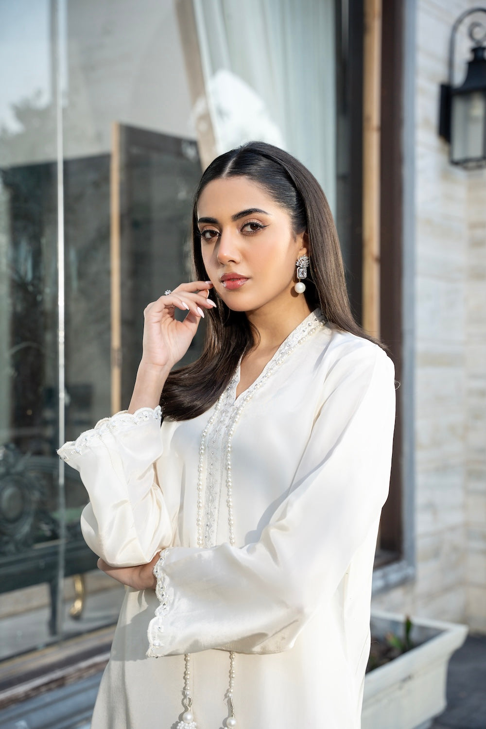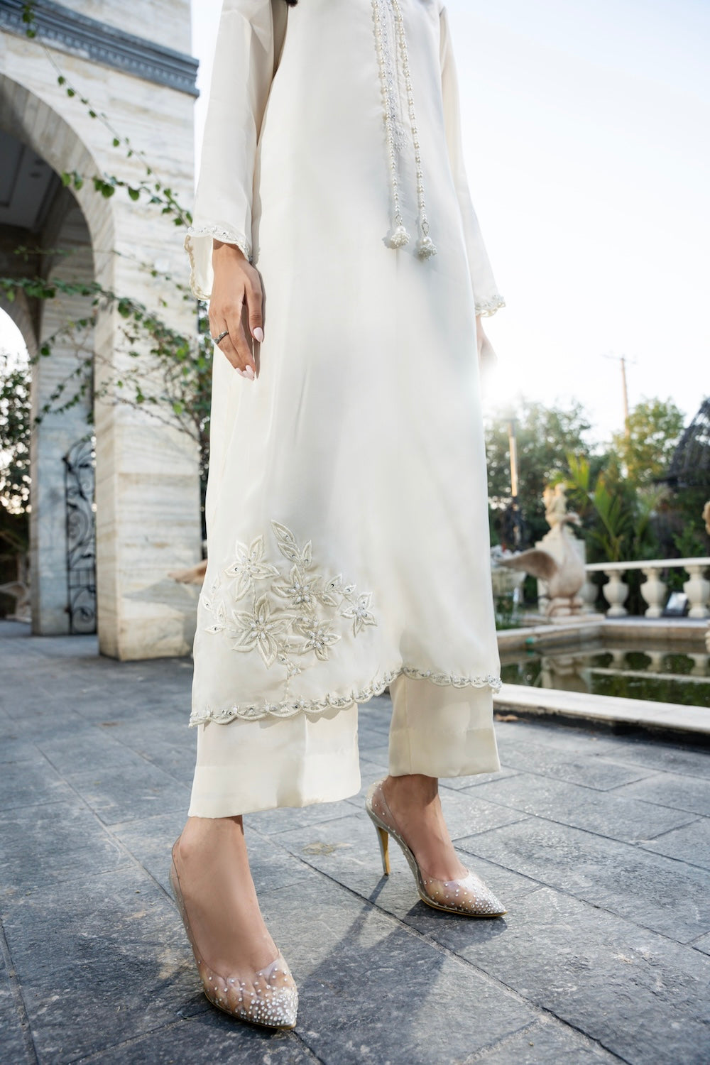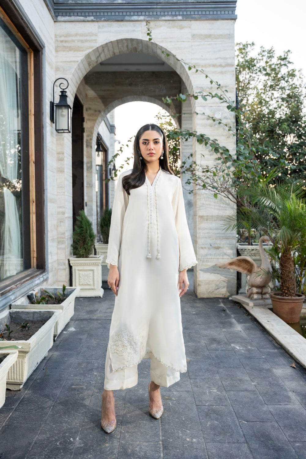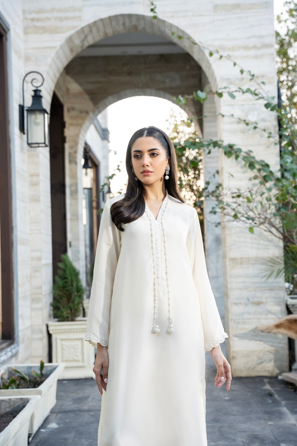 Elegant and refined, this pristine white ensemble features an overlapped neckline with tassels and delicate floral embroidery. Perfect for formal events and intimate celebrations, it’s timeless and effortlessly graceful.