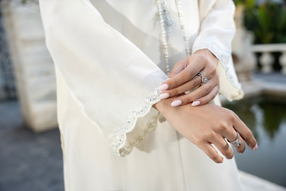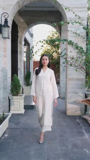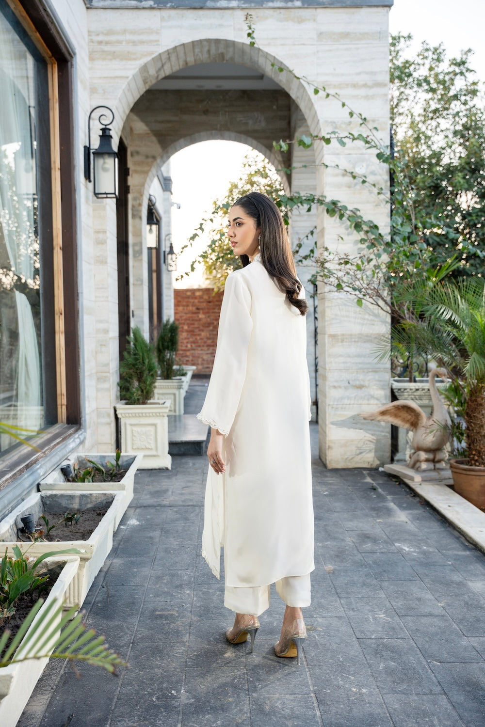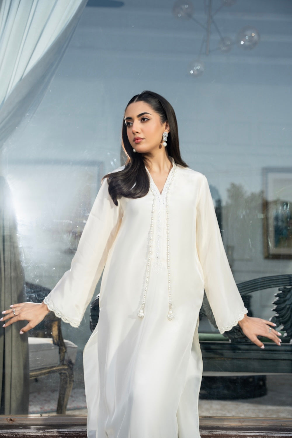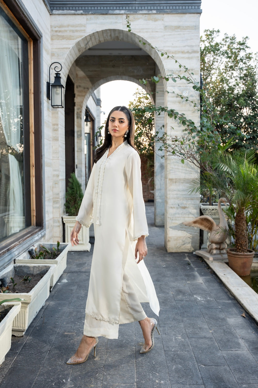 Elegant and refined, this pristine white ensemble features an overlapped neckline with tassels and delicate floral embroidery. Perfect for formal events and intimate celebrations, it’s timeless and effortlessly graceful.