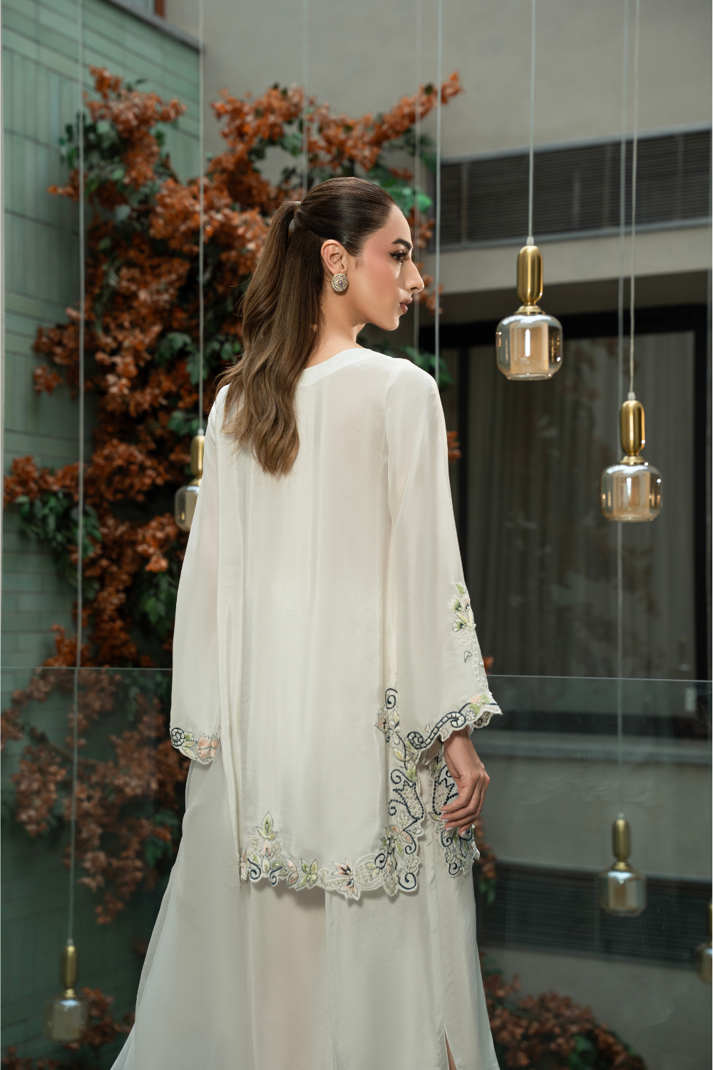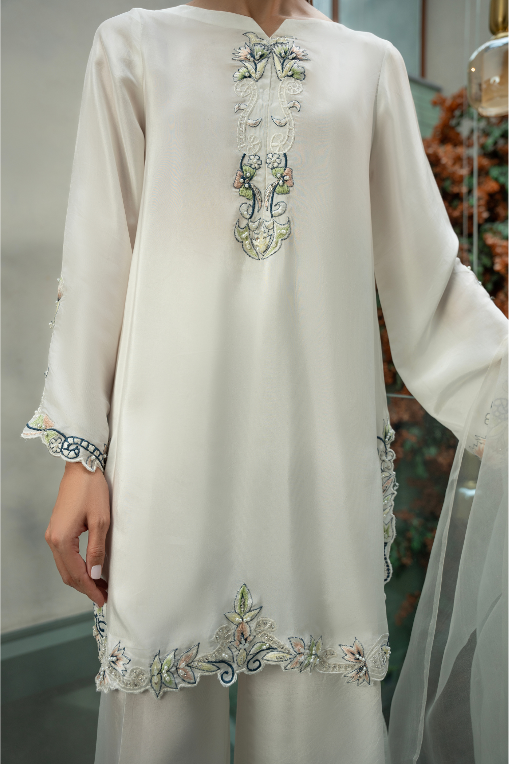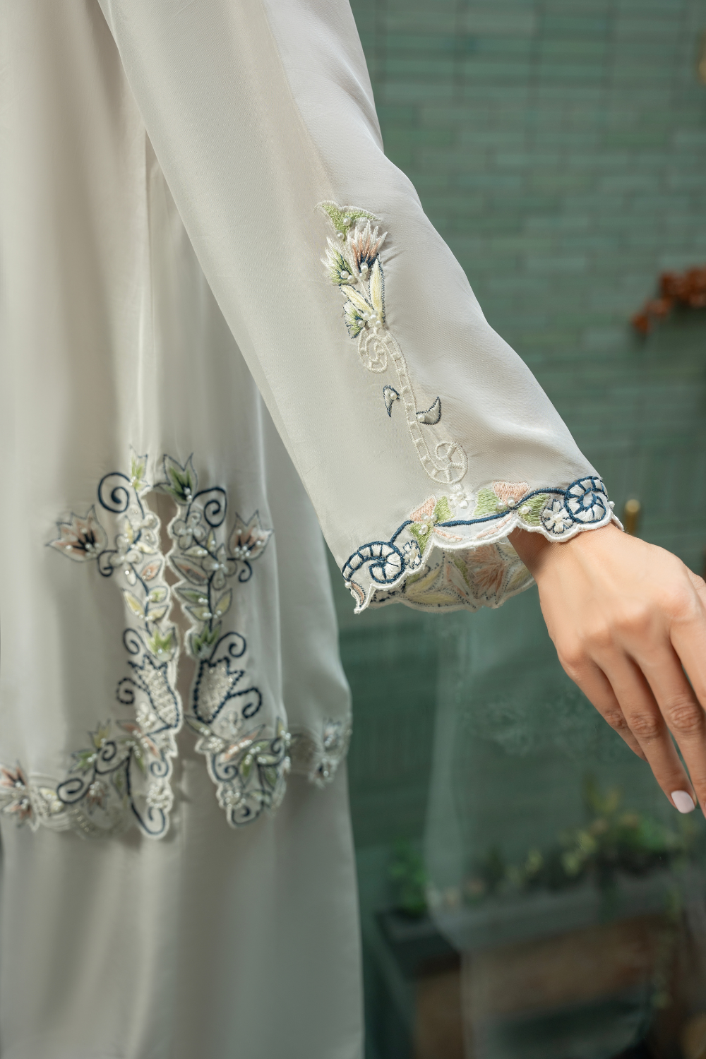 with delicate cutwork embroidery in soft, multi-hued tones across the shirt and