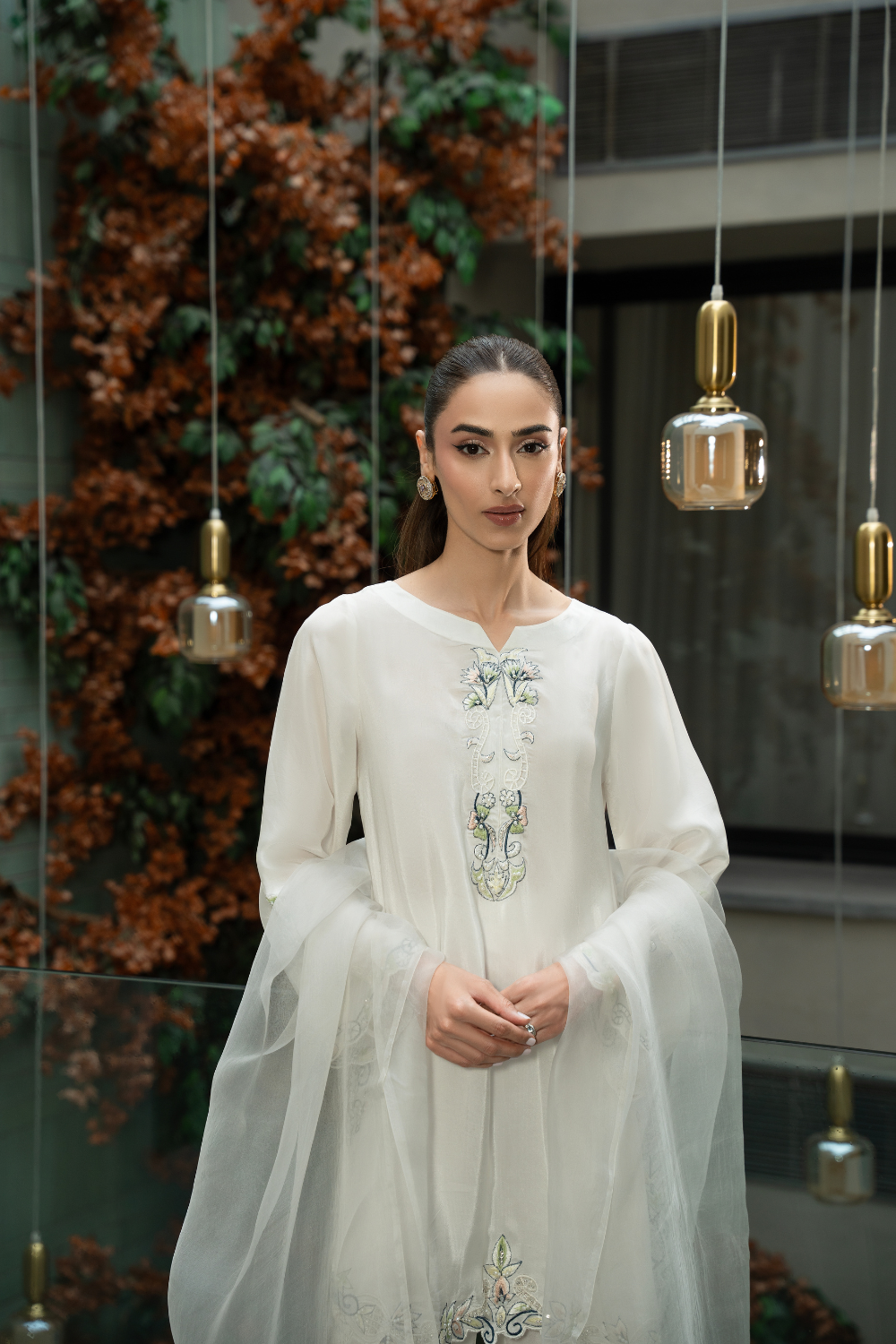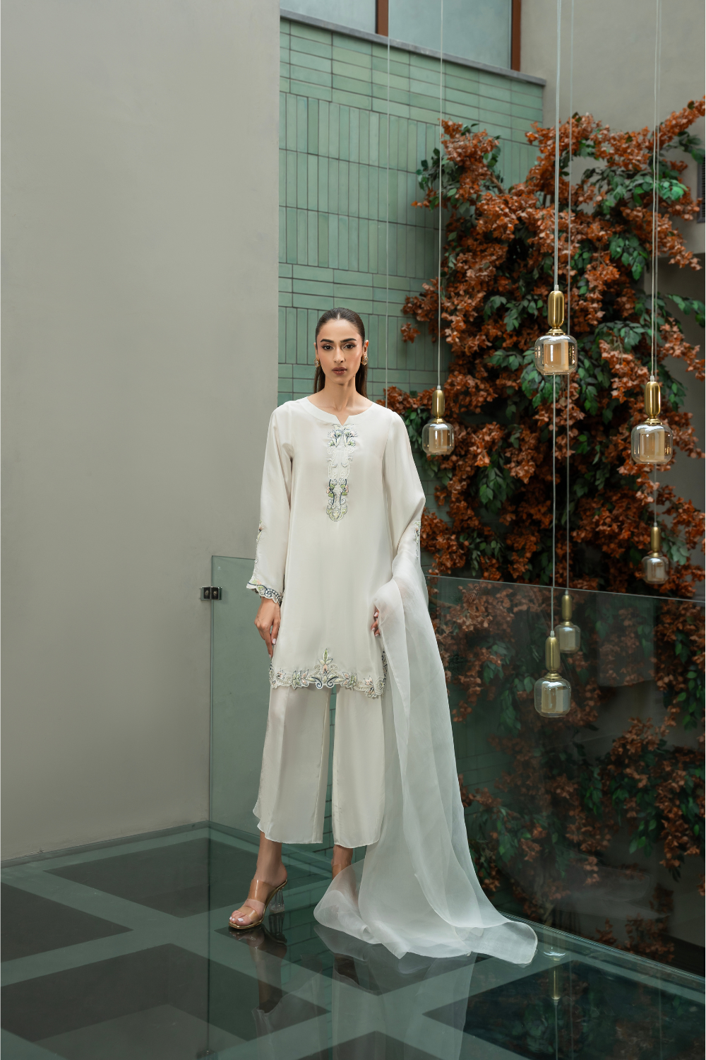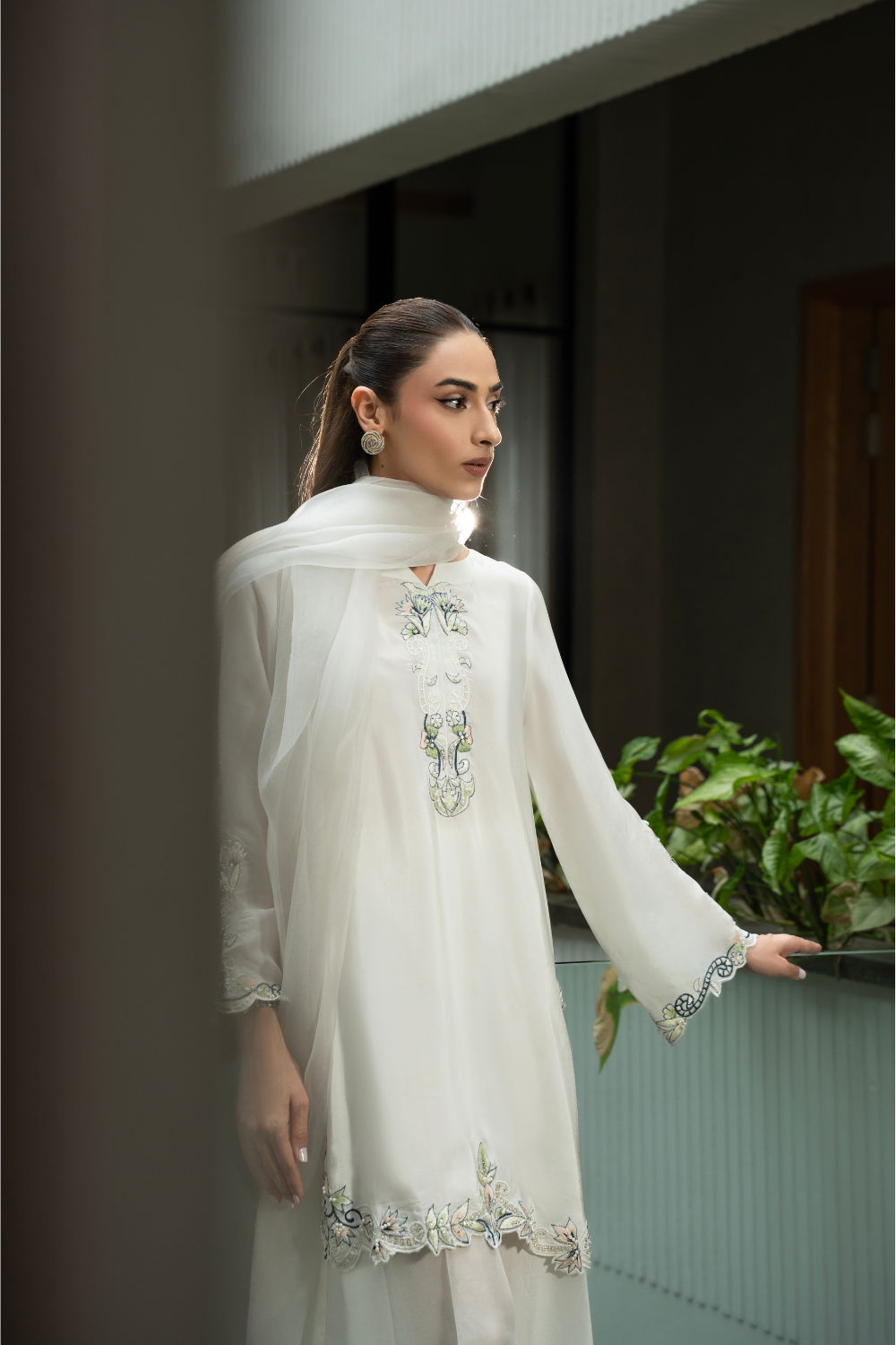 with delicate cutwork embroidery in soft, multi-hued tones across the shirt and