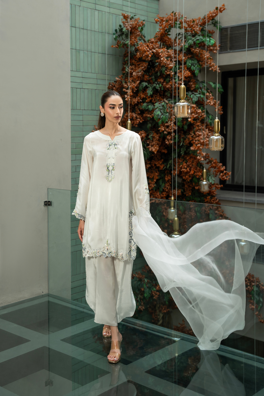 A forever classic in white, this V-neck shirt with signature AZ pants is elevated