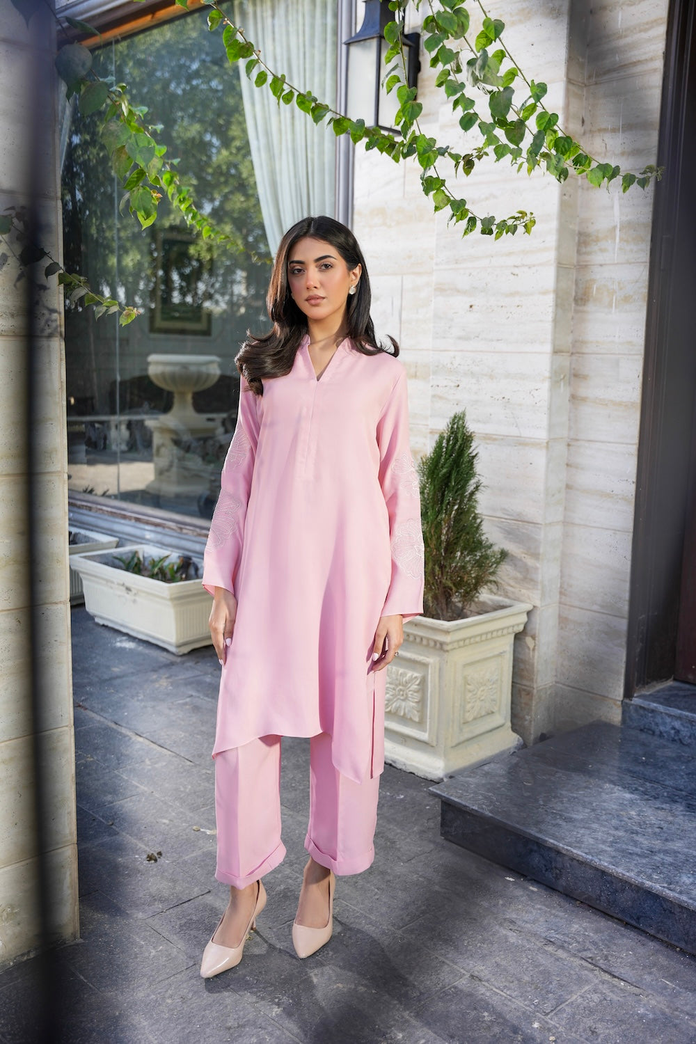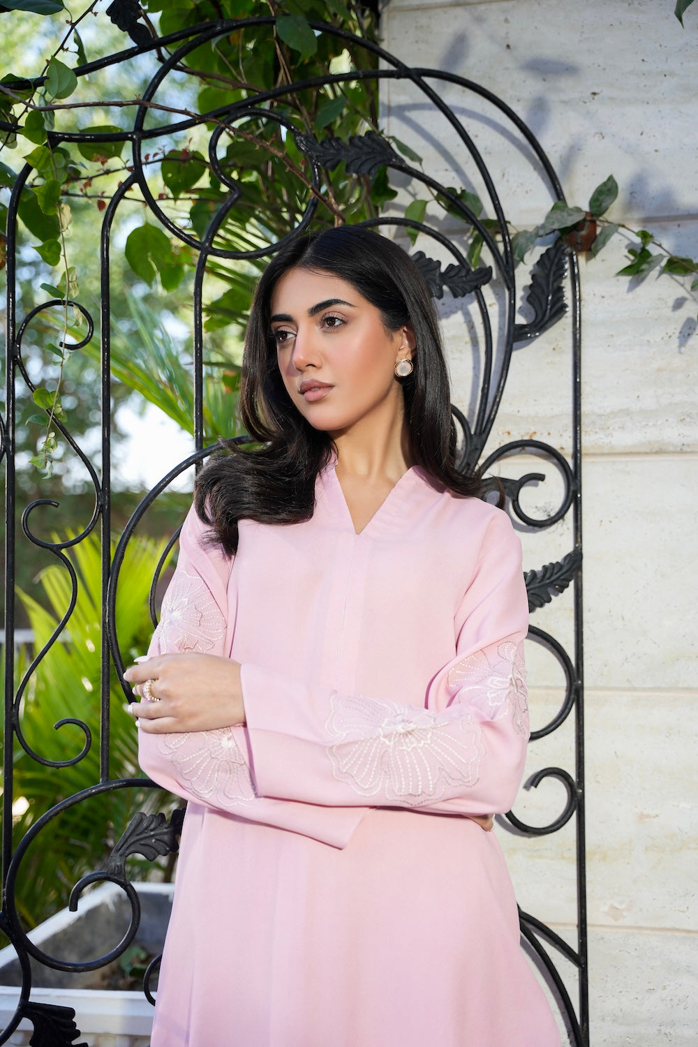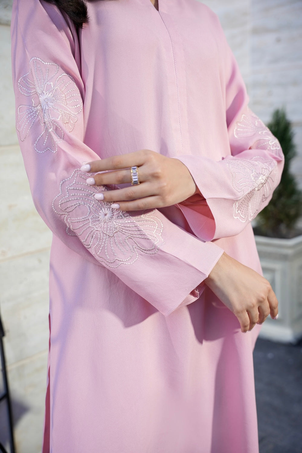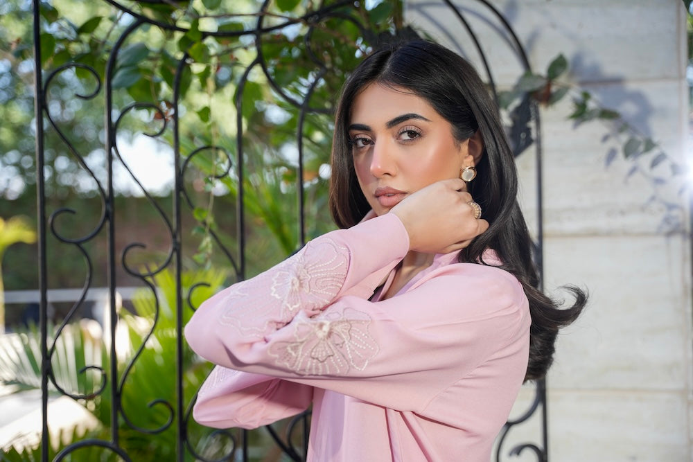 A perfect blend of soft and chic, this ensemble features delicate floral embroidery on the sleeves, adding a touch of elegance. Designed with subtle details that make all the difference, Nia is the epitome of graceful sophistication.