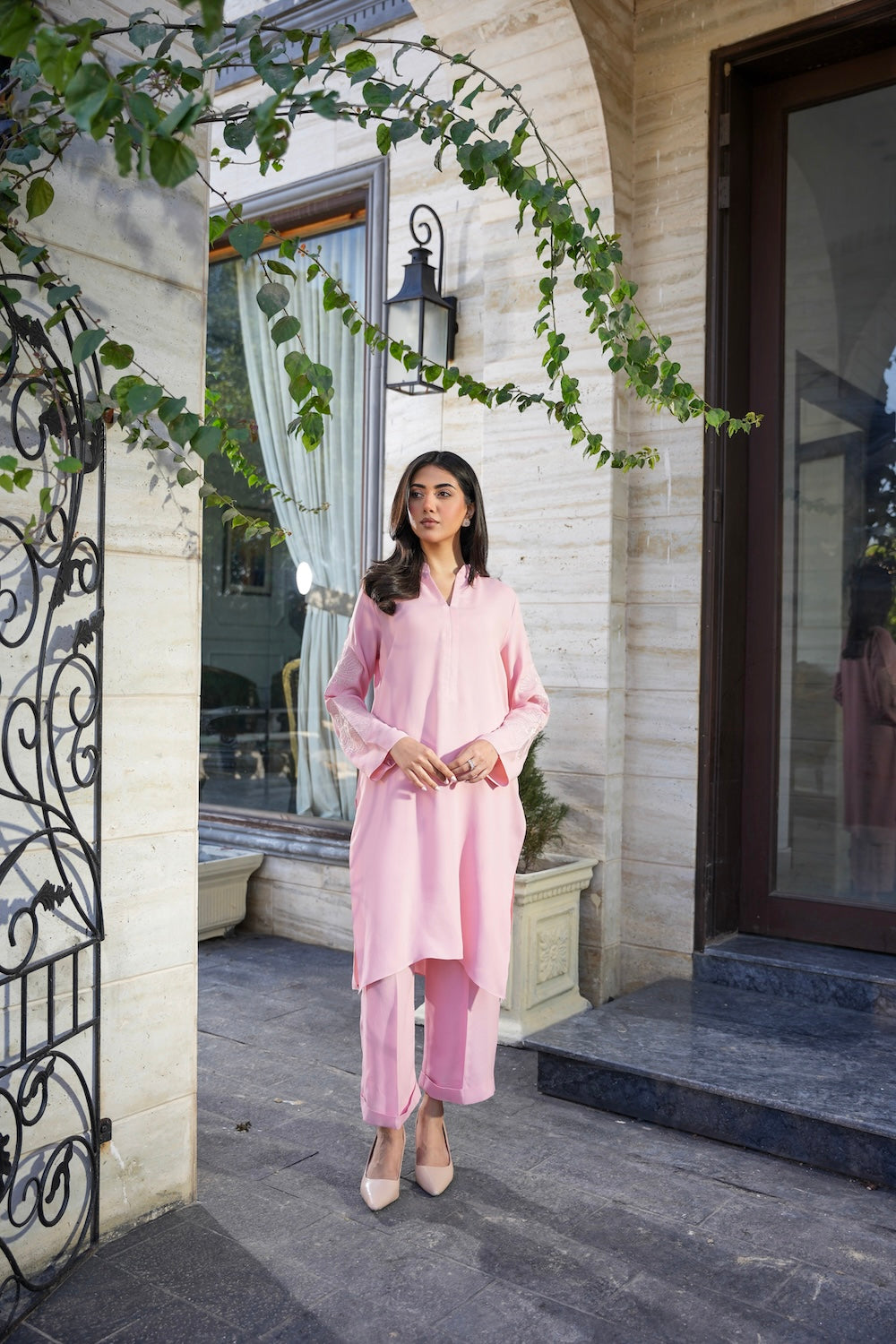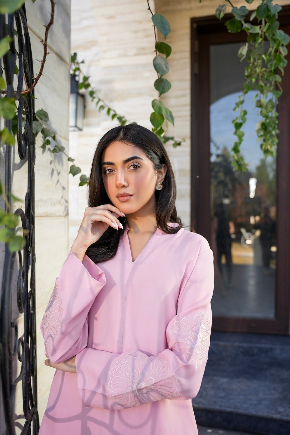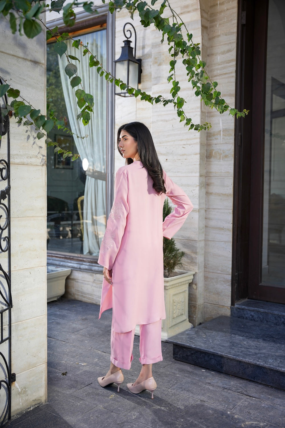 A perfect blend of soft and chic, this ensemble features delicate floral embroidery on the sleeves, adding a touch of elegance. Designed with subtle details that make all the difference, Nia is the epitome of graceful sophistication.
