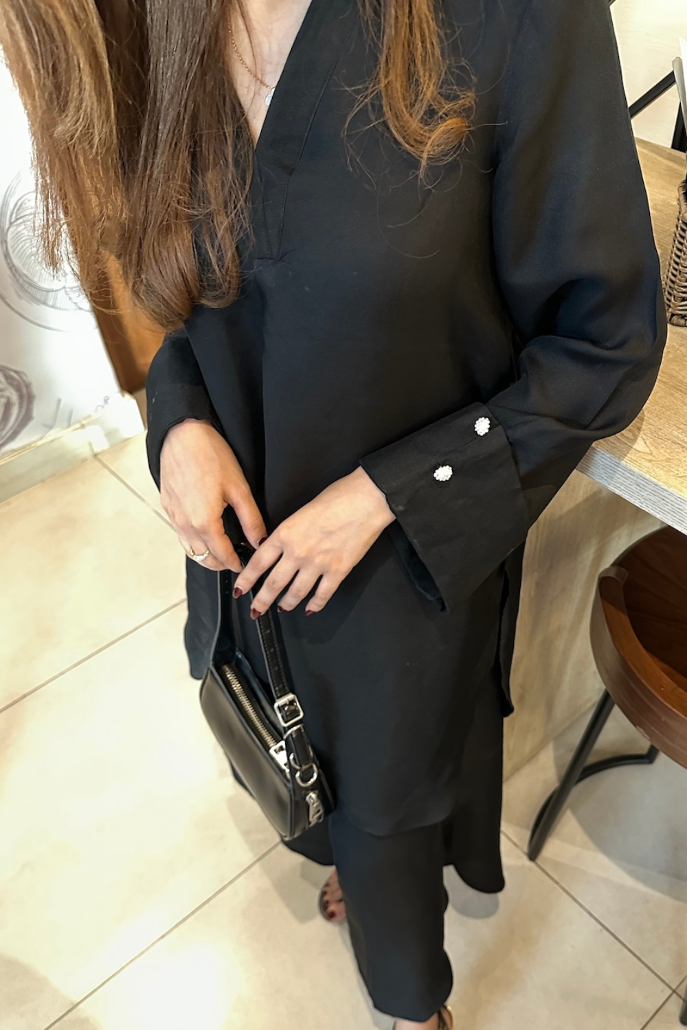 Chic sandstone outfit showcasing a round shirt with pearl buttons on the sleeves and breezy pants with side slits.