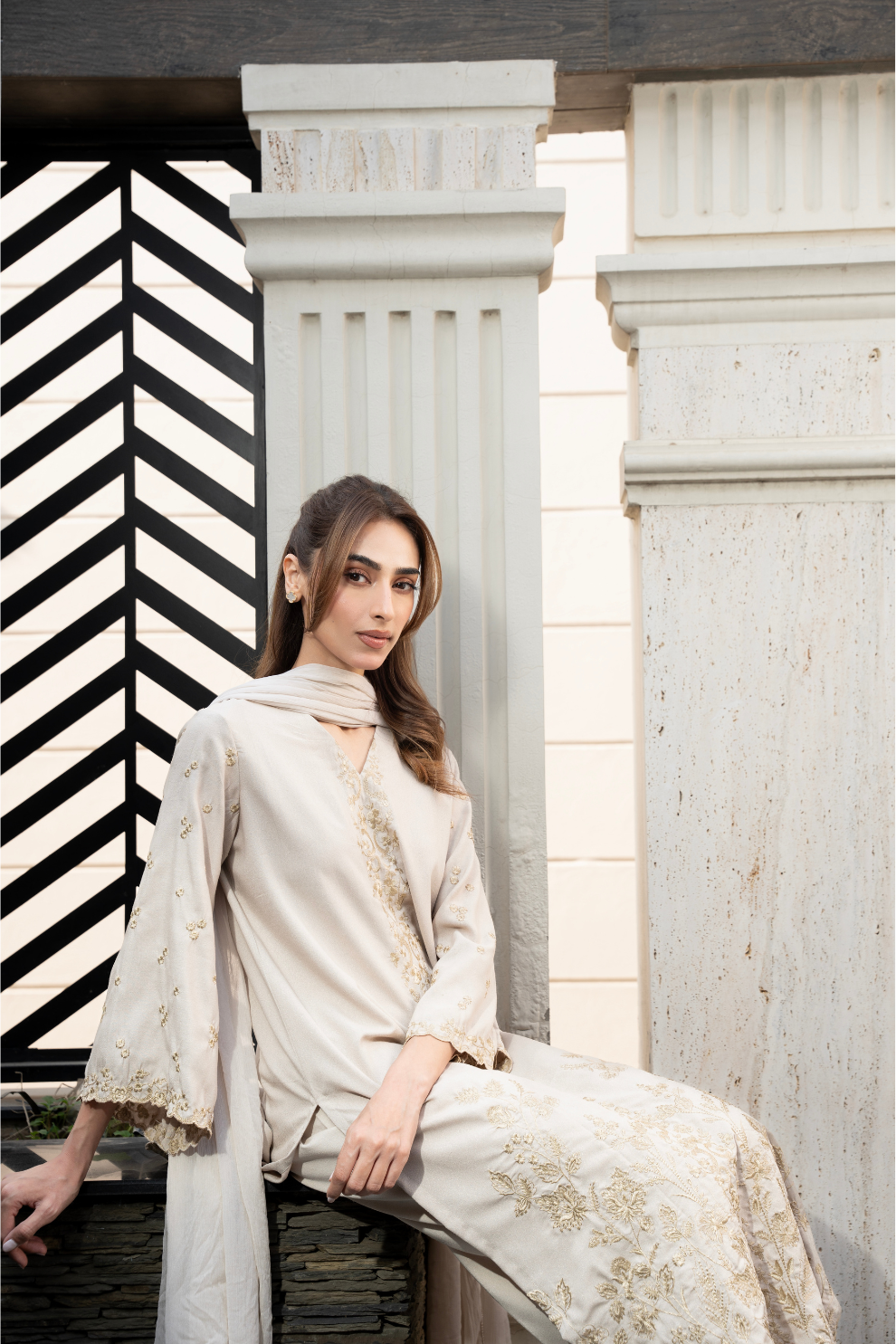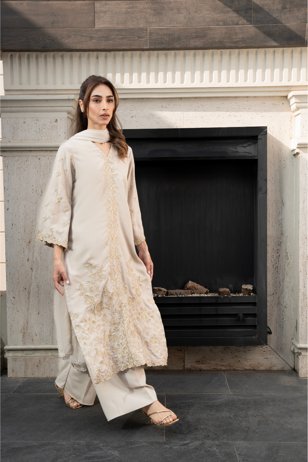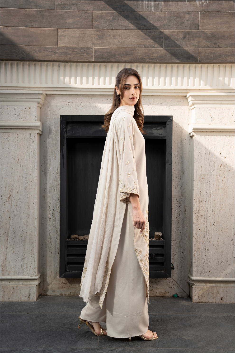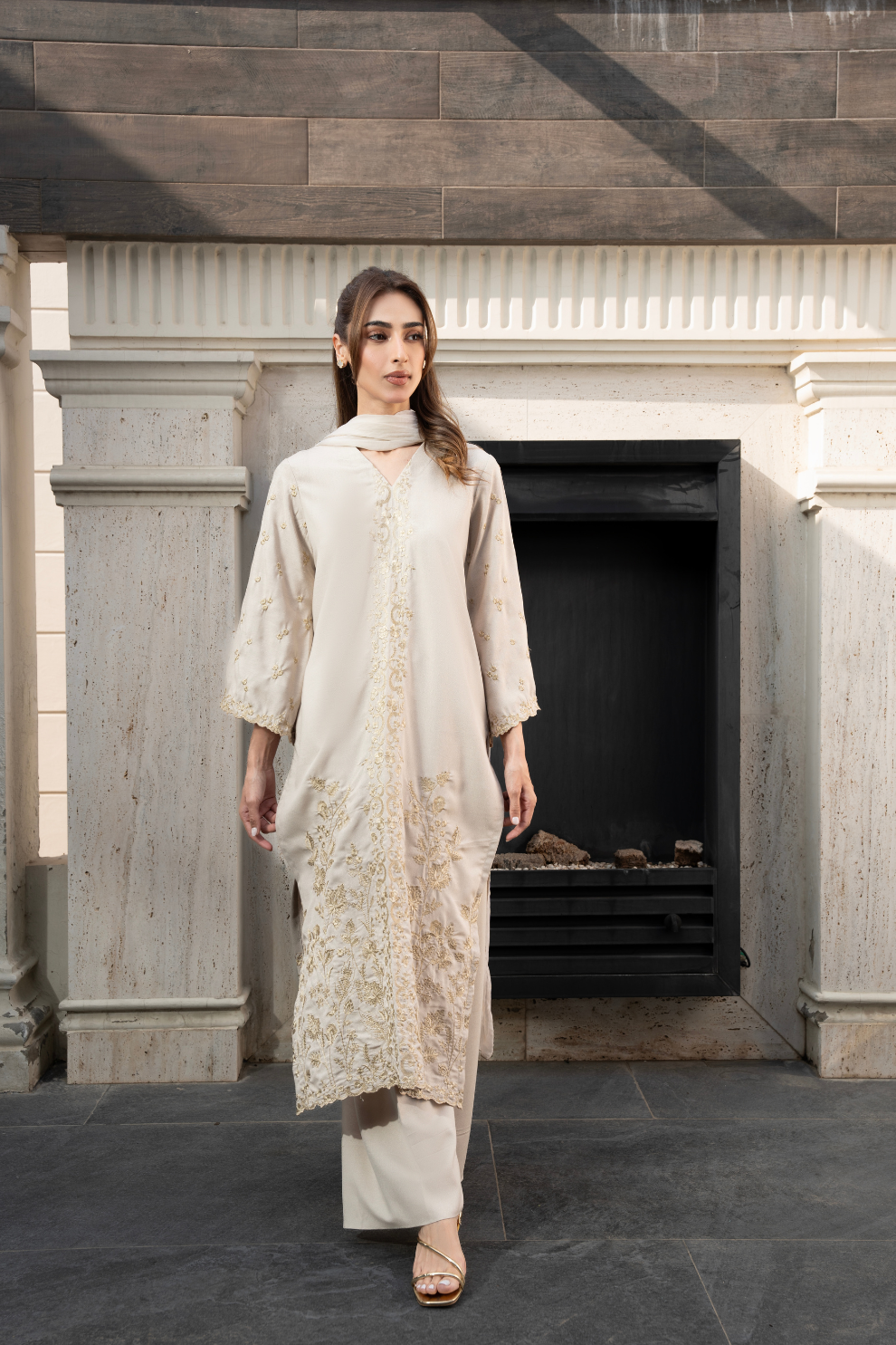 A long, flowing shirt with floral embroidery along the hem, neckline, and sleeves. Clean, minimal, effortlessly refined.