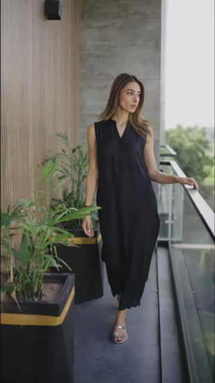Signature black outfit with a V-neckline and buttons. The scalloped trousers add a fun detail, making it ideal for both a casual day or dressier outings.