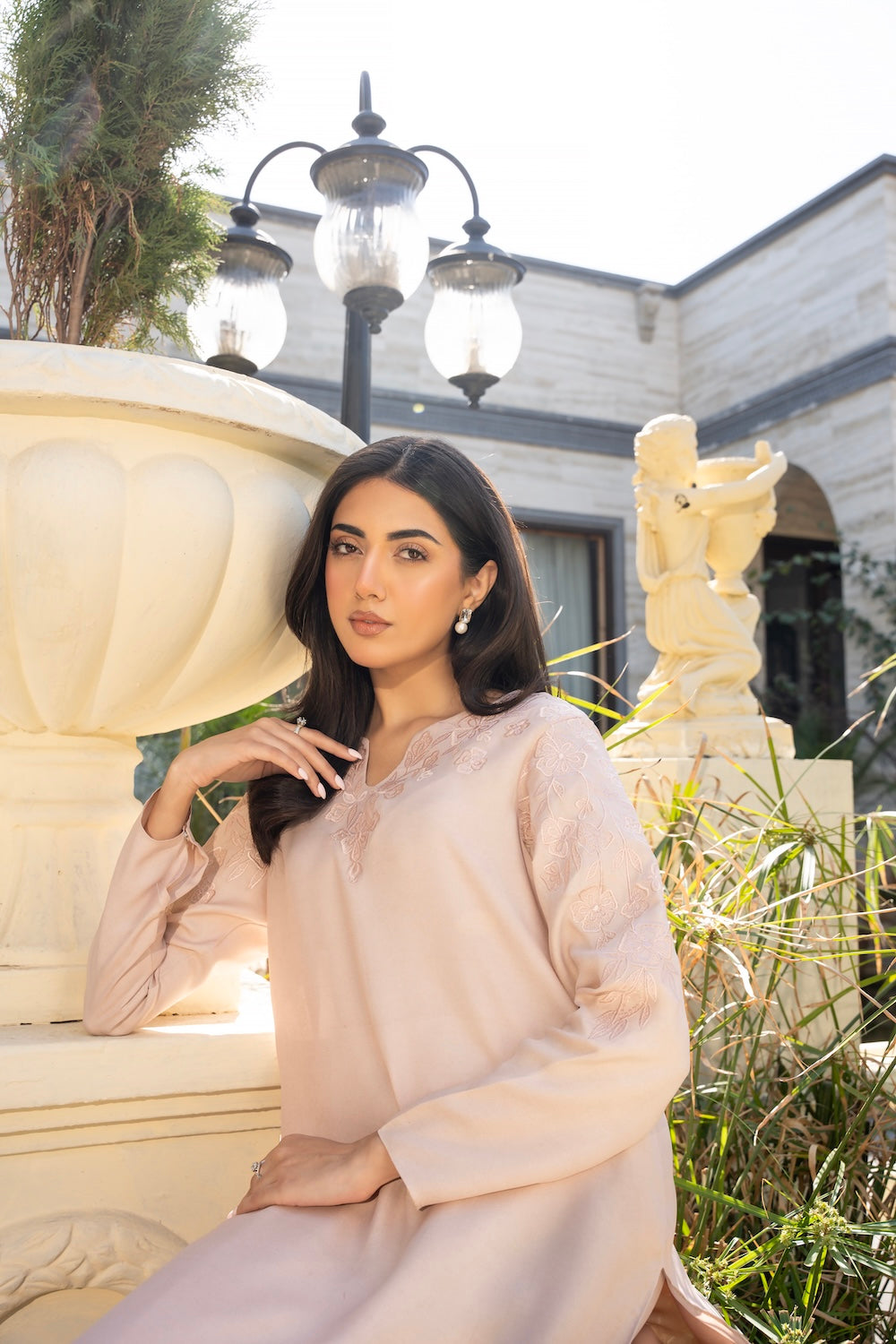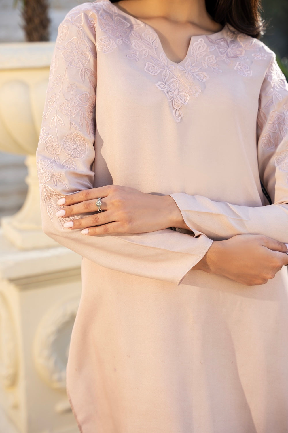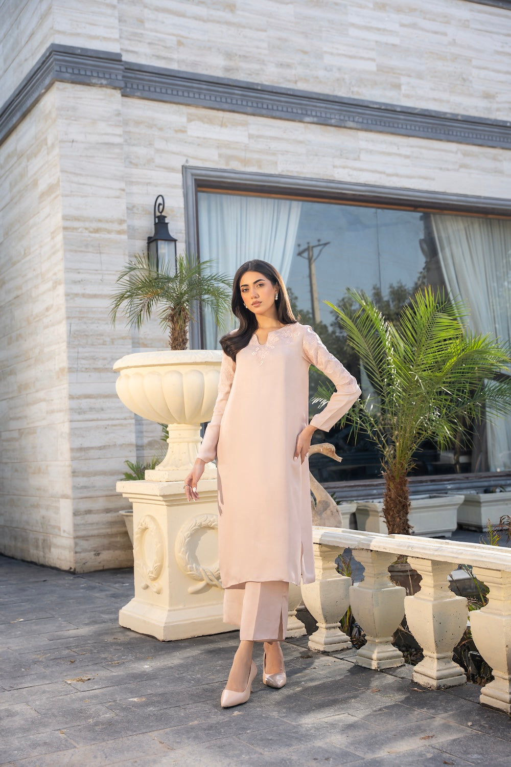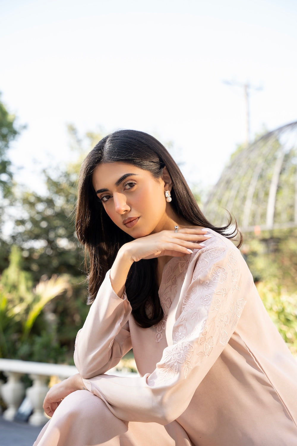 A dreamy blend of delicate details and effortless charm, this ensemble features intricate embroidery on the sleeves and neckline, adding a touch of elegance. Paired with sleek slit pants for the perfect flow, Veyra is designed for refined style with a modern edge.